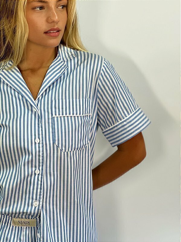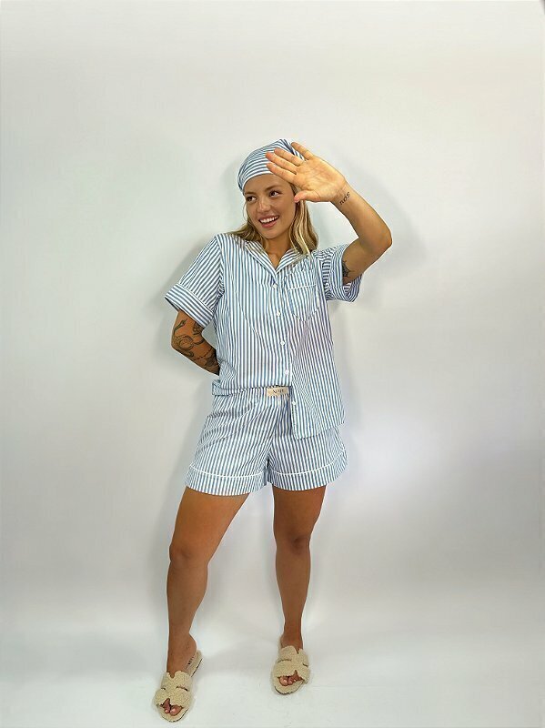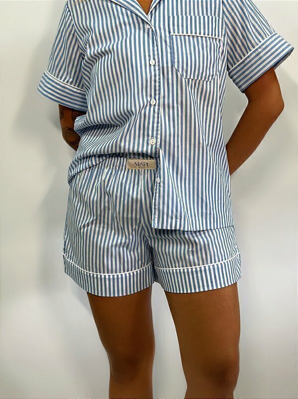 Conjunto de pijama feminino em tecido plano 100% algodão, ideal para noites confortáveis e momentos de relaxamento com estilo. O modelo possui uma estampa de listras clássicas em azul, com detalhes em viés contrastante que trazem um charme especial. A camisa conta com botões frontais e um bolso discreto no lado esquerdo, garantindo praticidade e sofisticação. O short tem cintura elástica com ajuste perfeito, proporcionando conforto ao vestir.