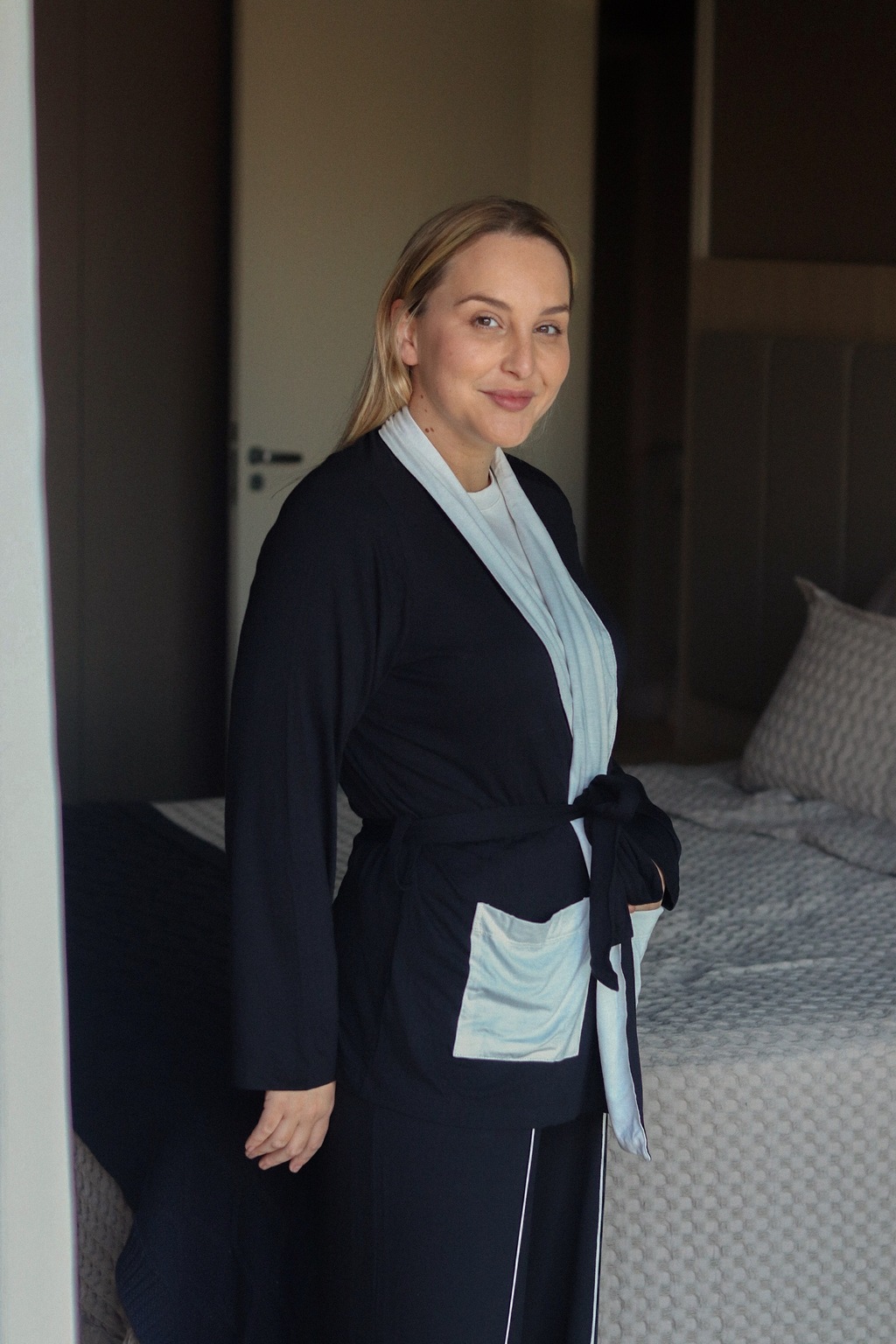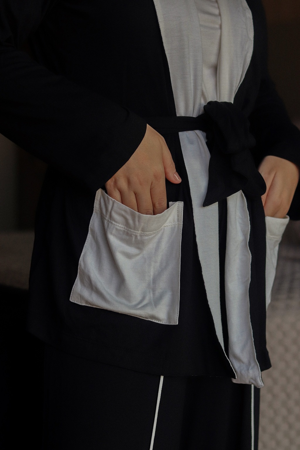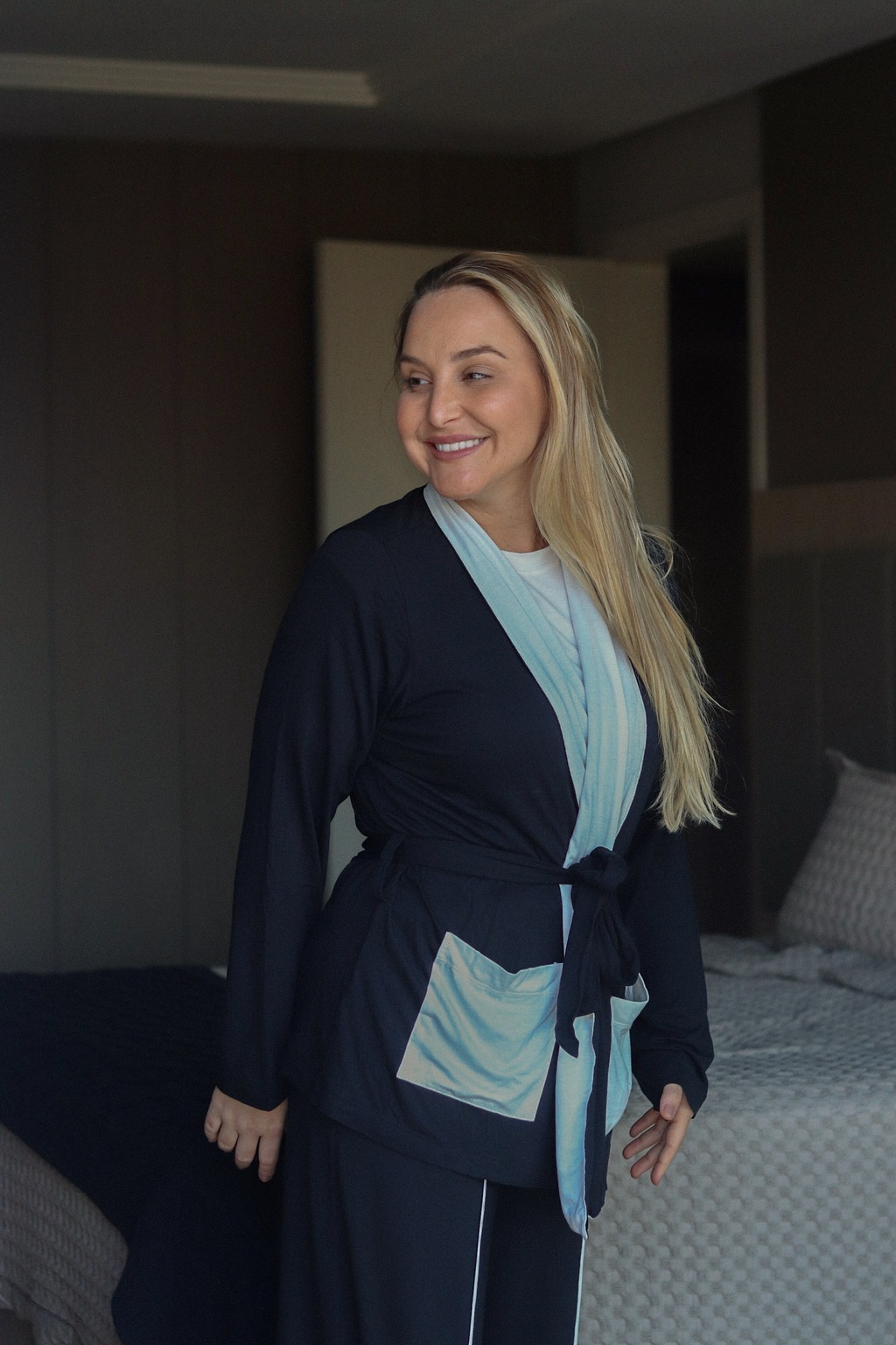 Perfeito para noites de sono revigorantes, momentos de descanso em casa ou para compor looks de homewear sofisticados. O robe acrescenta um toque de elegância extra, permitindo que o conjunto seja usado também em ocasiões casuais que pedem conforto aliado a estilo.